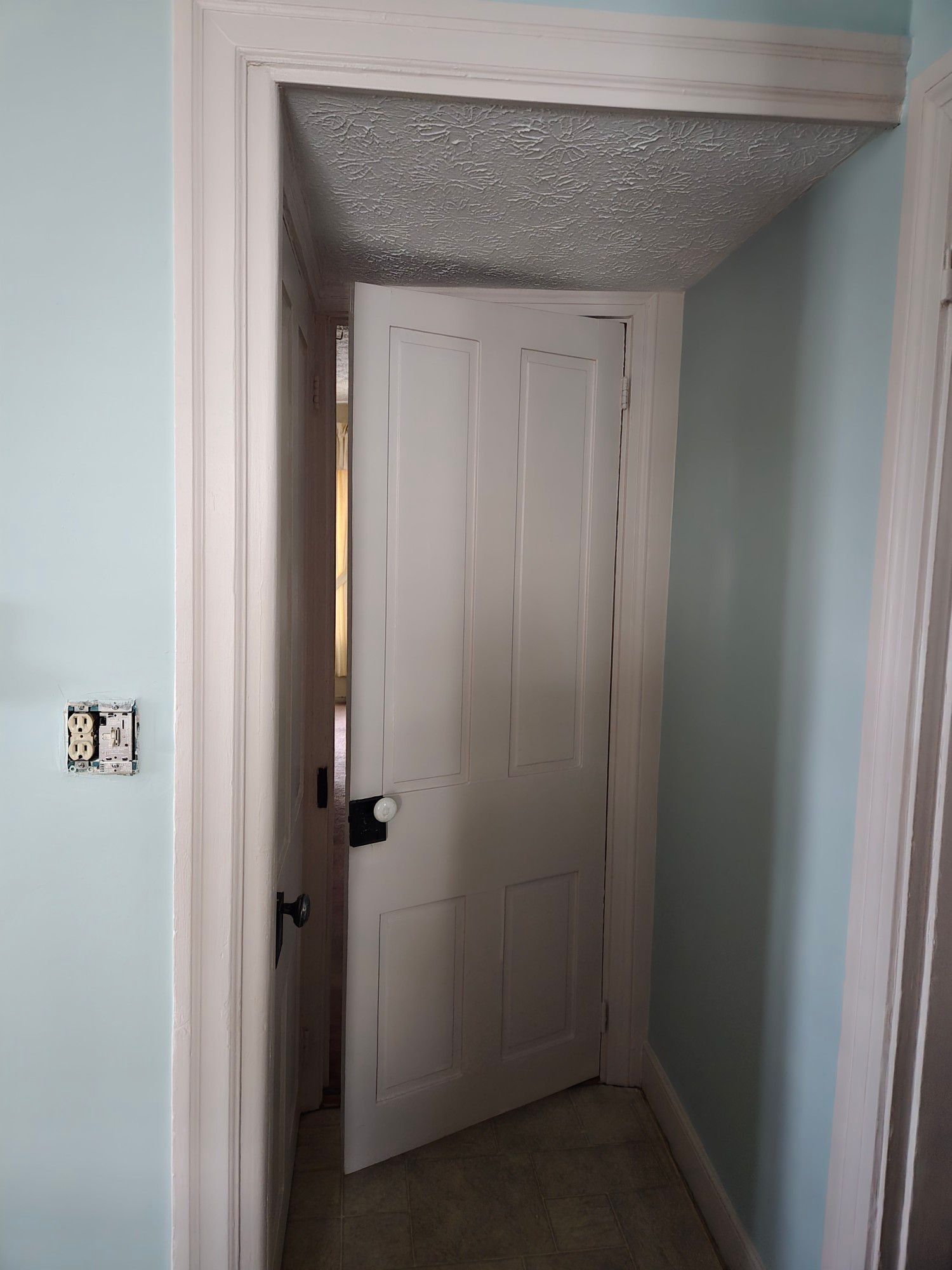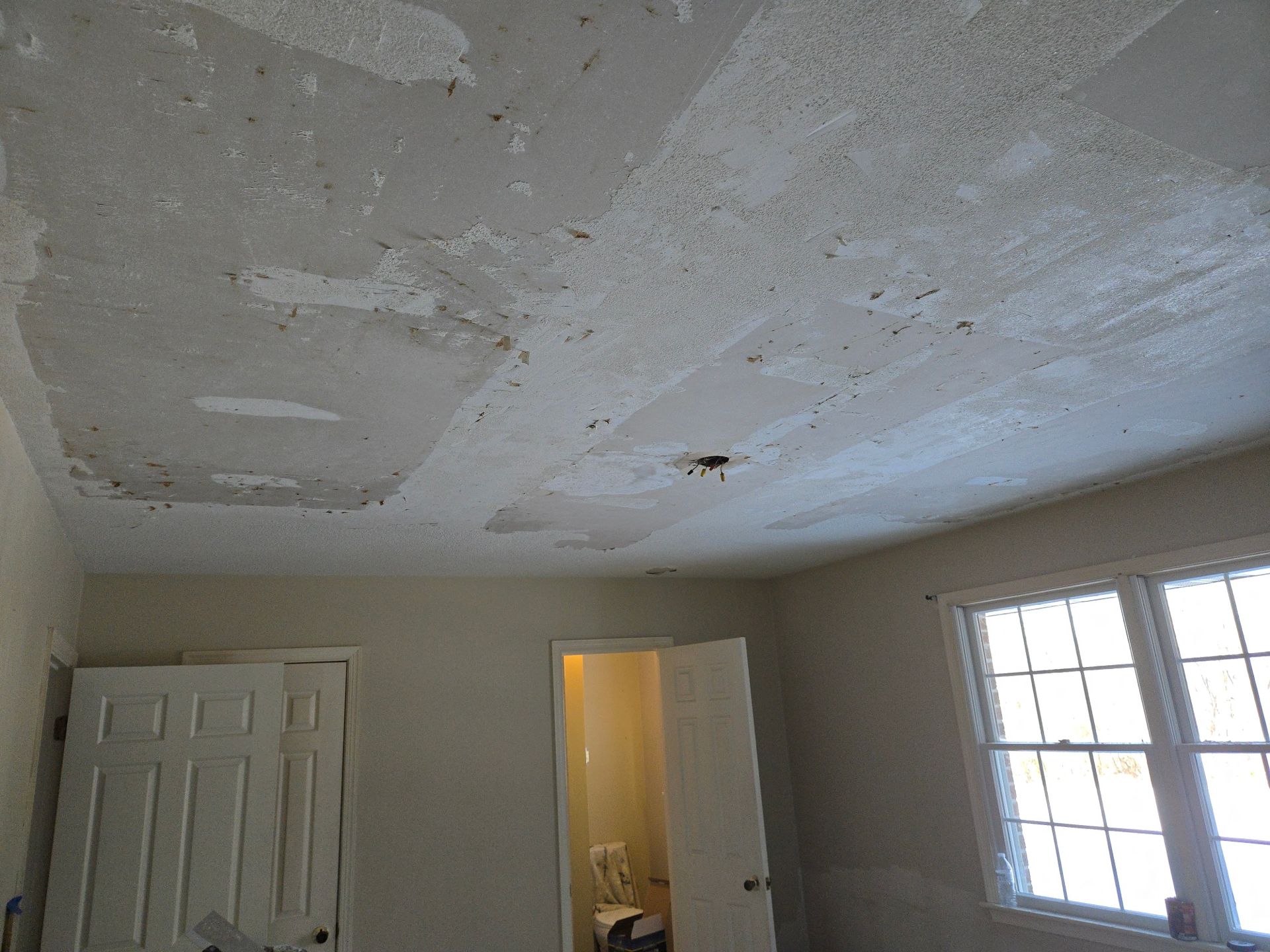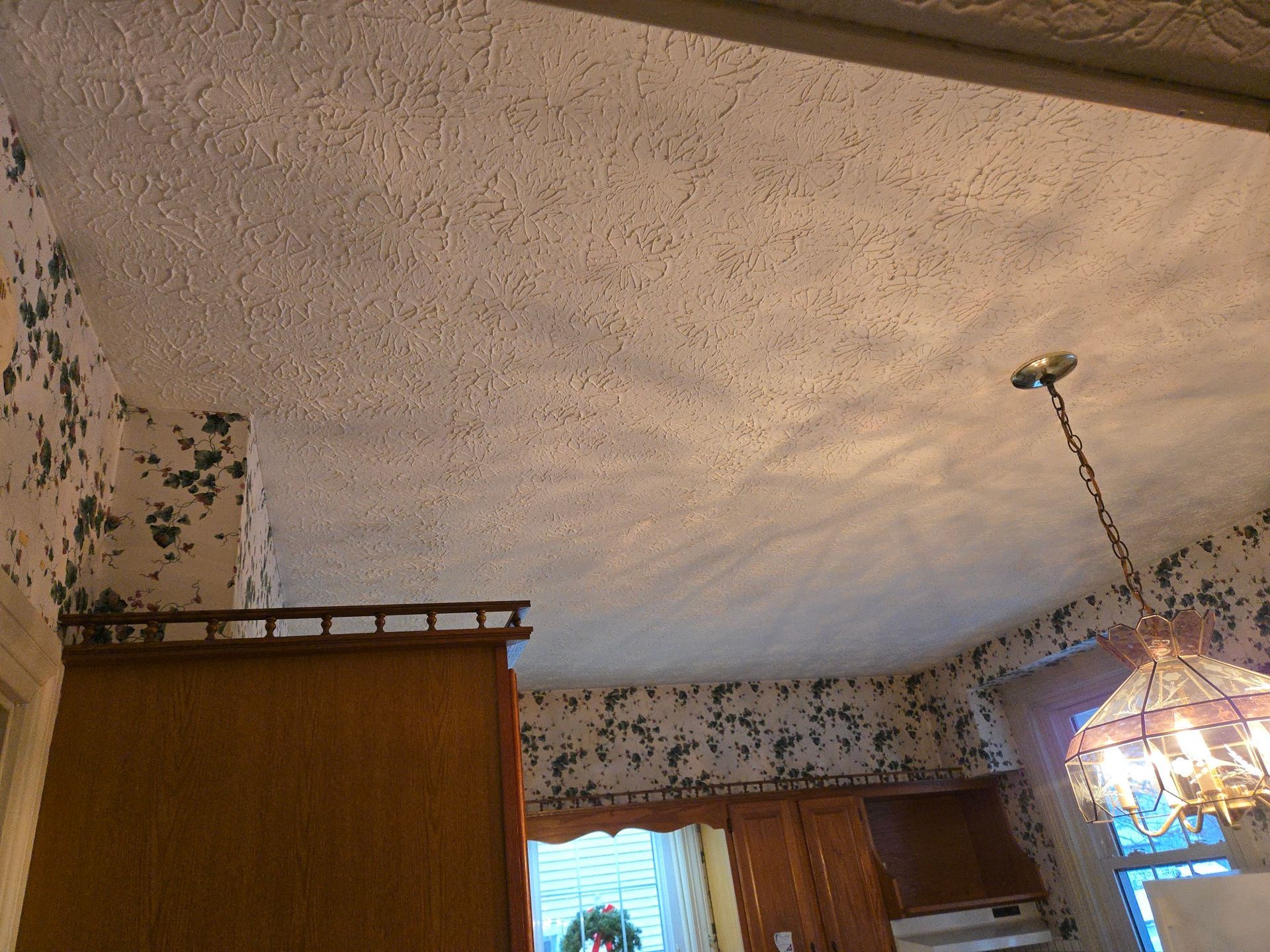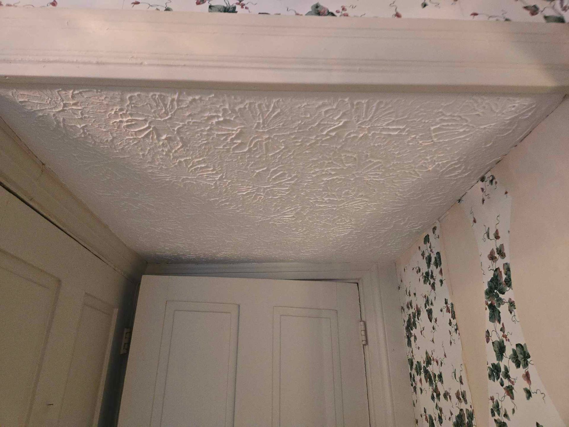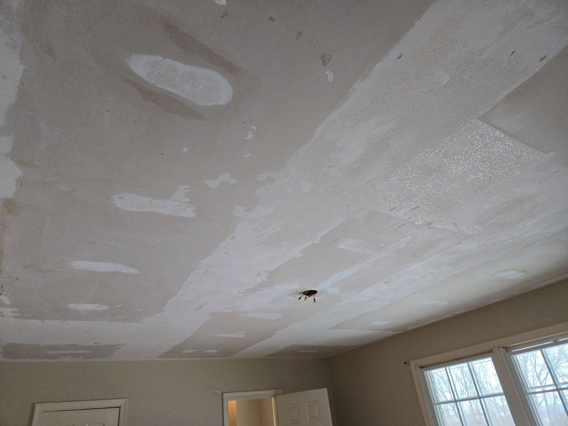 The popcorn ceiling was removed using a vacuum-connected power sander to control dust, then skim-coated and sealed with Seal Grip® primer to block decades of smoke damage from cigarettes and a wood stove. The result is a smooth, clean finish throughout the space.