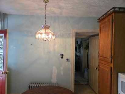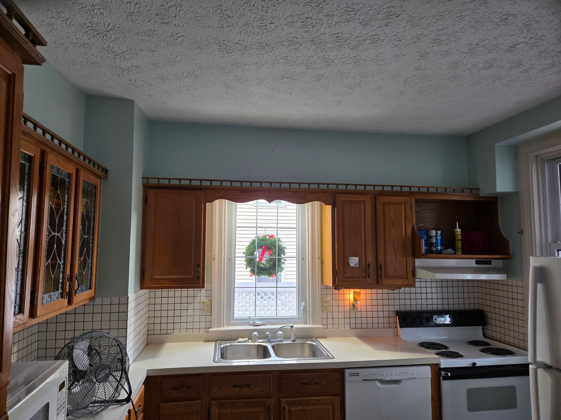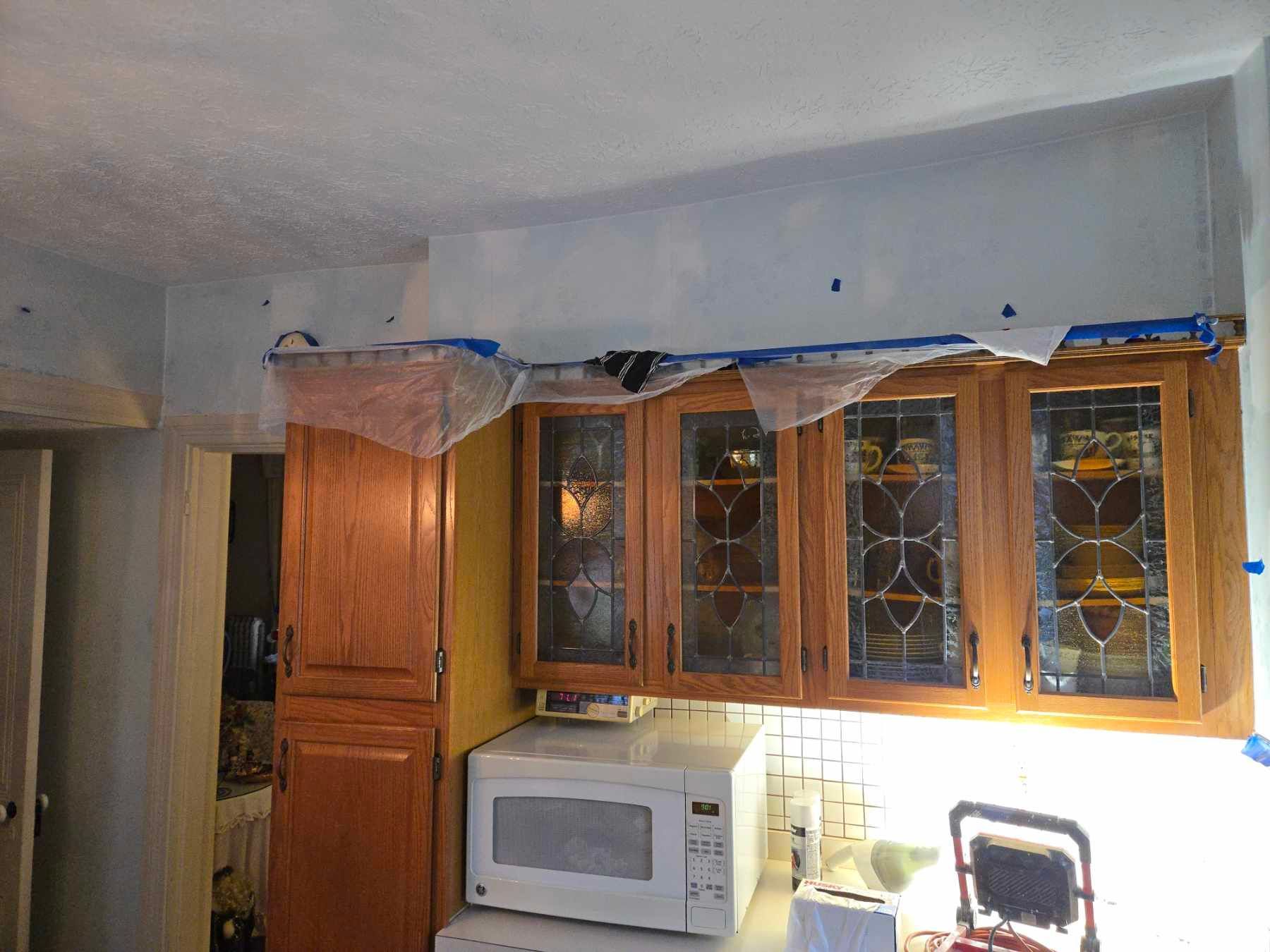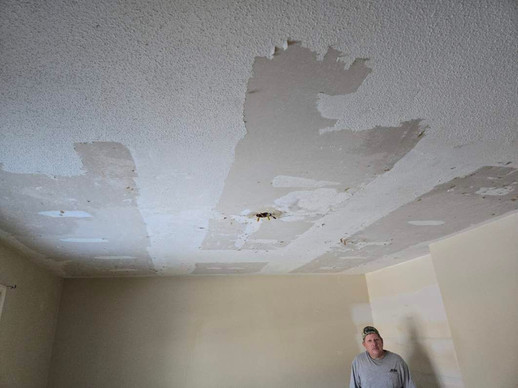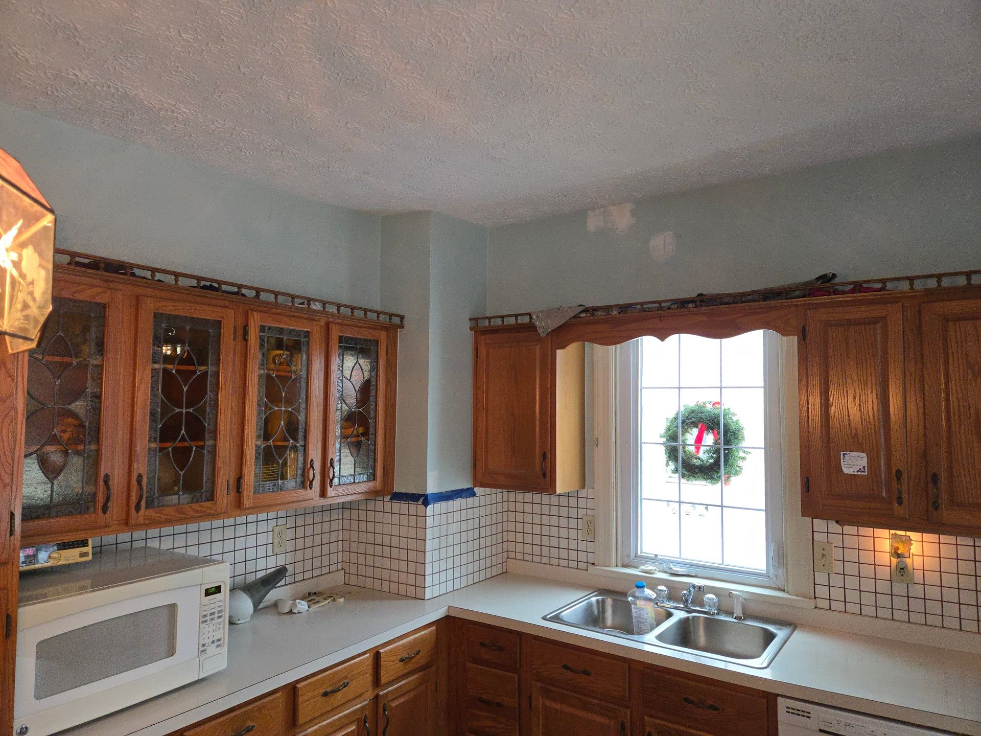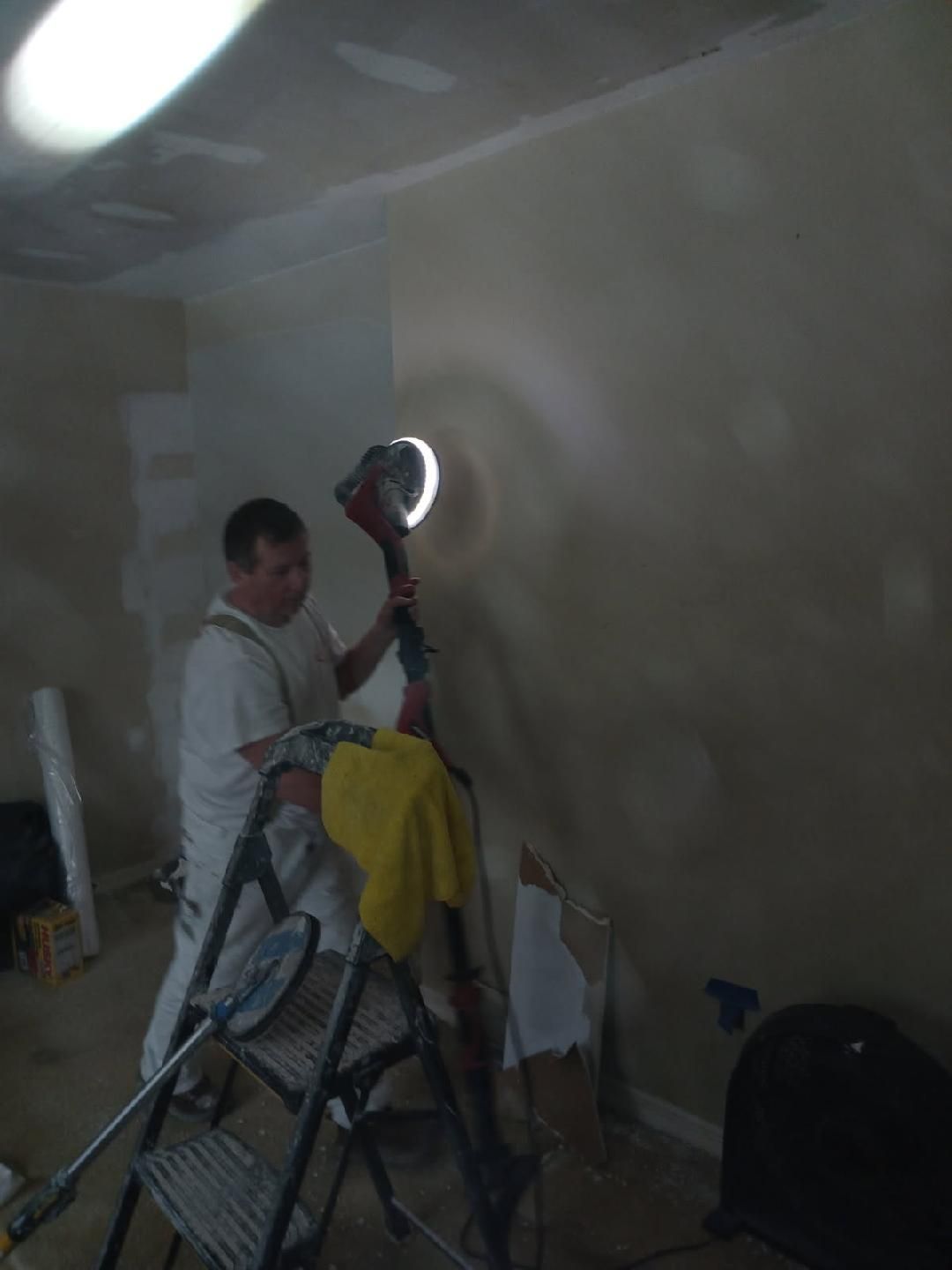 The popcorn ceiling was removed using a vacuum-connected power sander to control dust, then skim-coated and sealed with Seal Grip® primer to block decades of smoke damage from cigarettes and a wood stove. The result is a smooth, clean finish throughout the space.