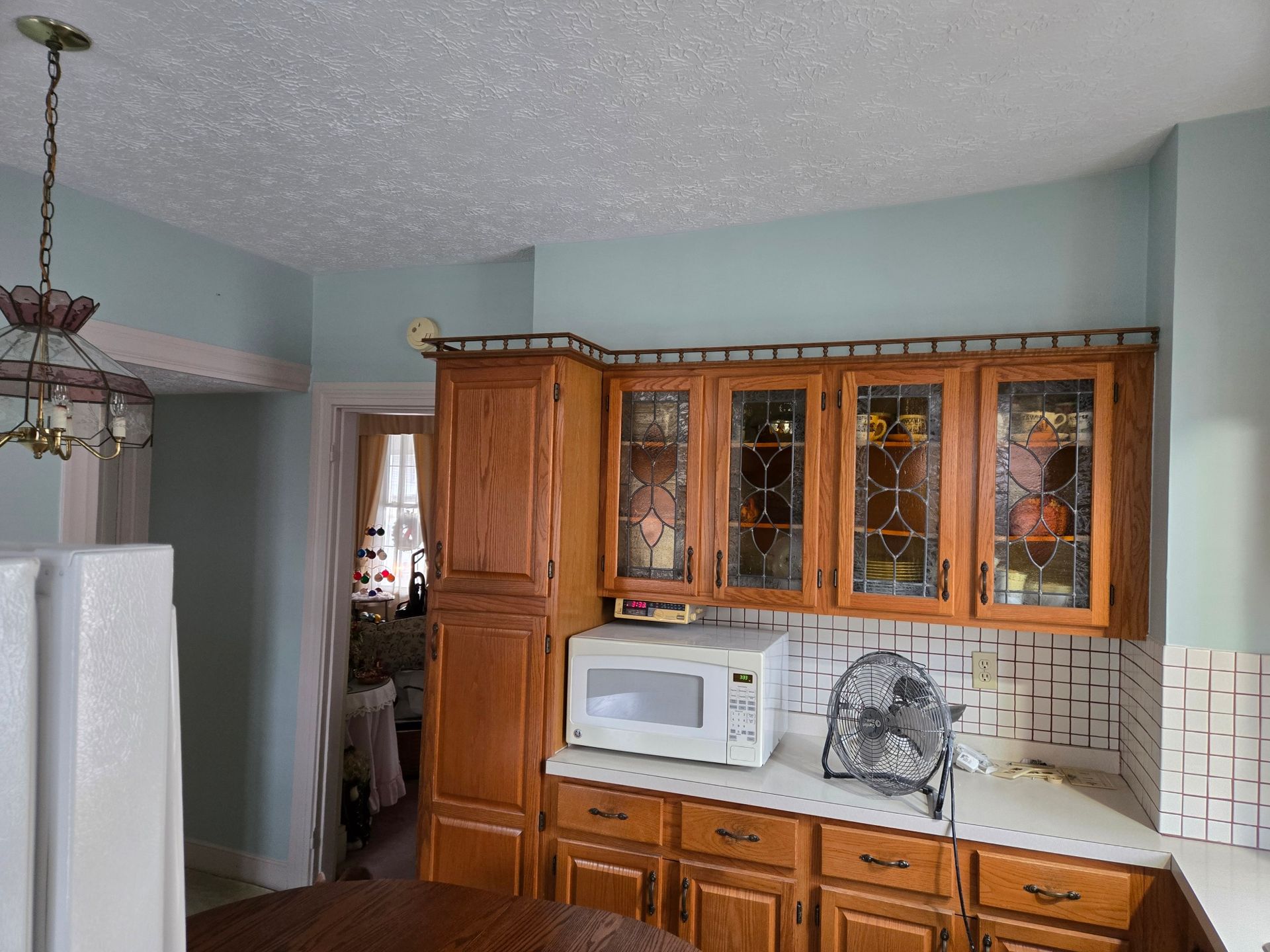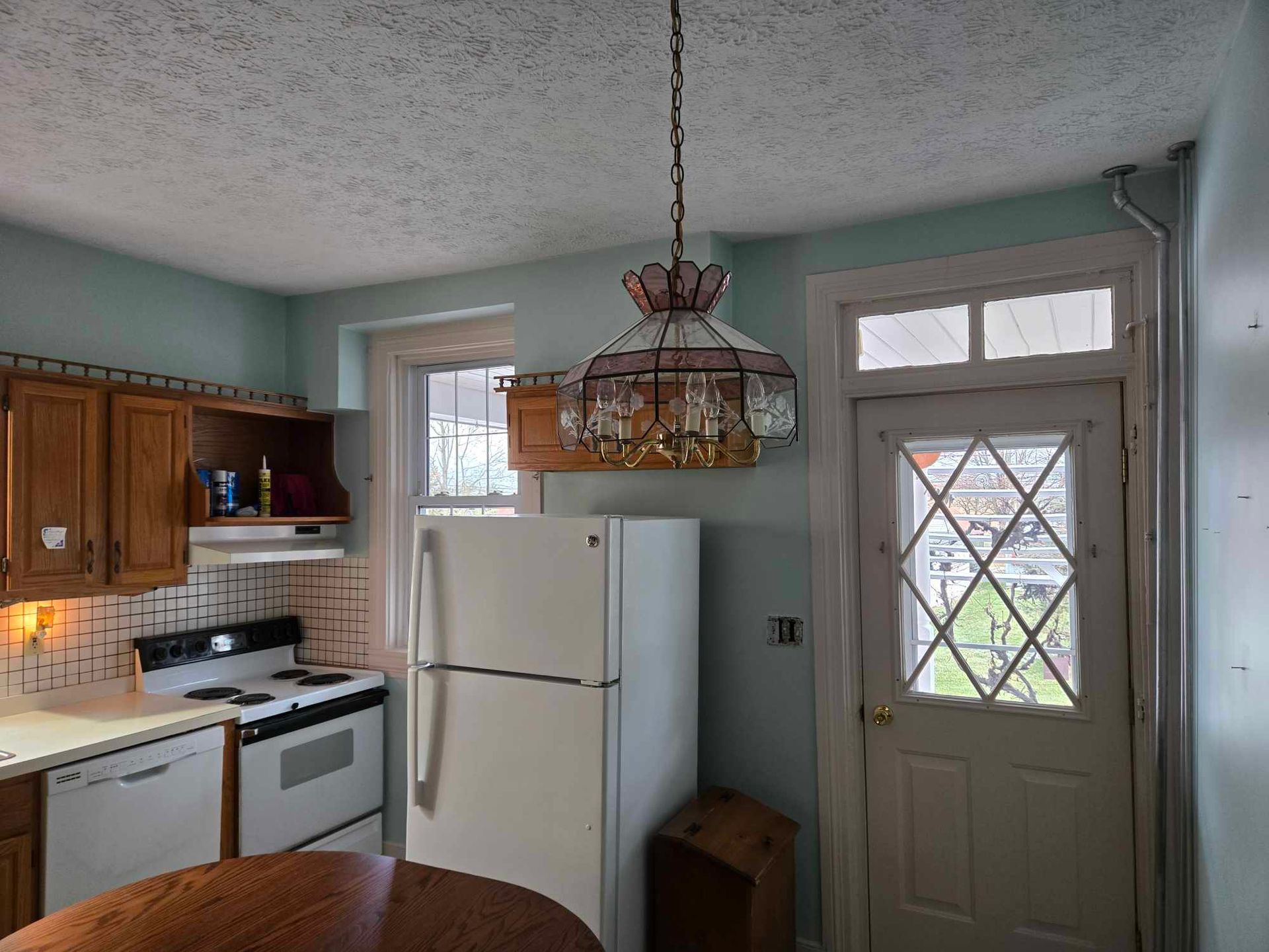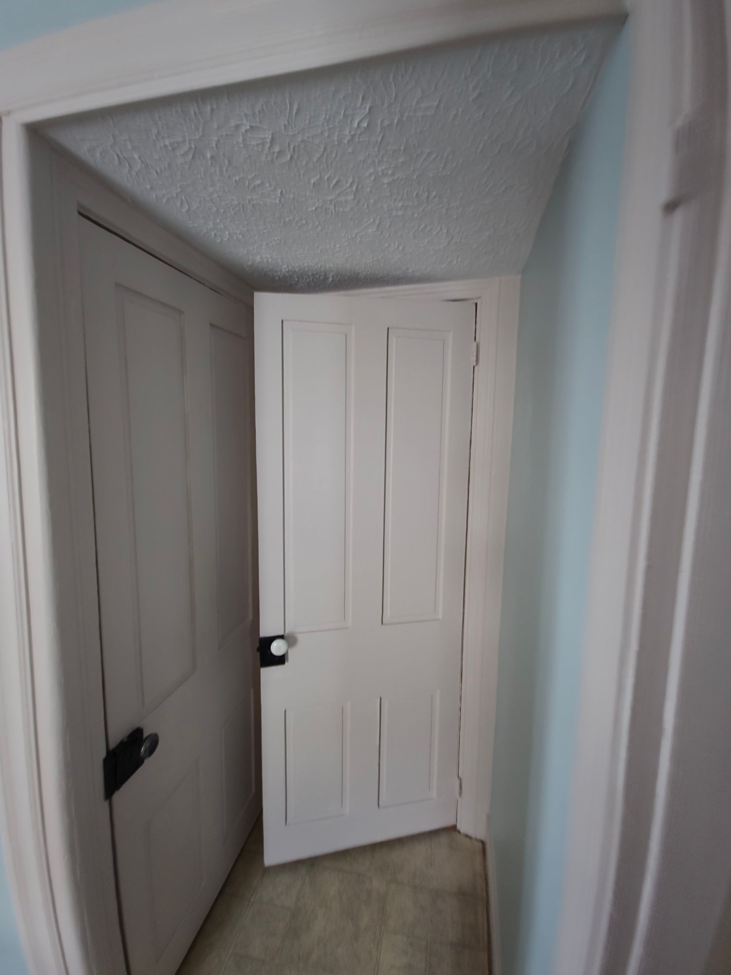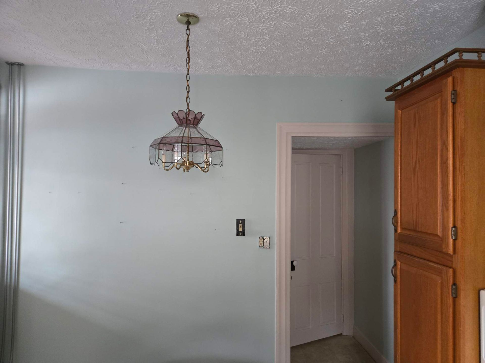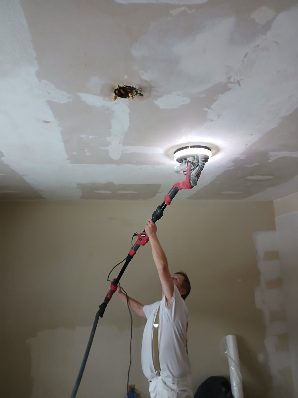 The popcorn ceiling was removed using a vacuum-connected power sander to control dust, then skim-coated and sealed with Seal Grip® primer to block decades of smoke damage from cigarettes and a wood stove. The result is a smooth, clean finish throughout the space.